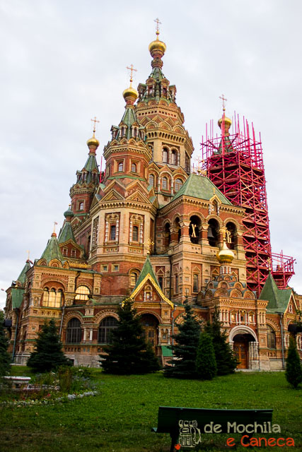 No dia em que fomos visitar o Palácio de Peterhof, nem imaginávamos que existia esta bela igreja. Assim que descemos do ônibus demos de cara com a Catedral de Pedro e Paulo de Peterhof, uma igreja do mesmo estilo das famosas igrejas de São Basílio, em Moscou e do Sangue Derramando, em São Petersburgo, de imediato a igreja nos encantou.