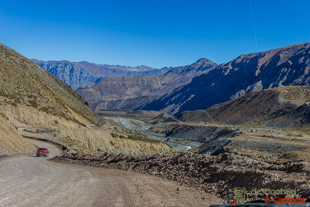 O que pega nesta estrada é que em alguns trechos só passa um veículo por vez e o que pega mais ainda é que em determinados momentos, além de encontrarmos outros carros de turistas e vans de agências, nos encontramos com caminhões gigantes de uma mineradora existente no local e aí…