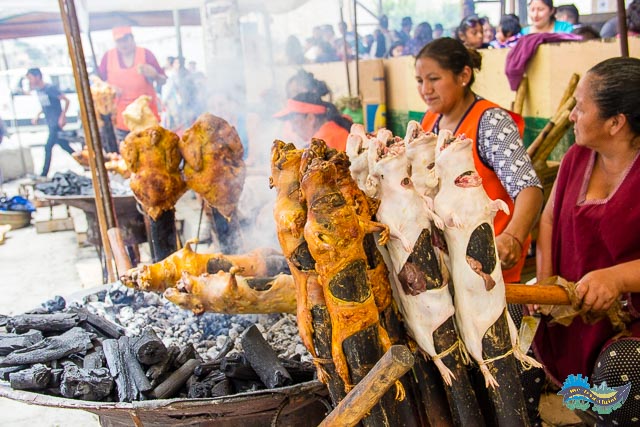 Na feira, além de frutas, verduras, carnes, artesanatos, utensílios e tudo que você pode imaginar, destaca-se a parte das comidas, onde entre outros pratos, é servido o cuy, uma iguaria típica de países andinos.
