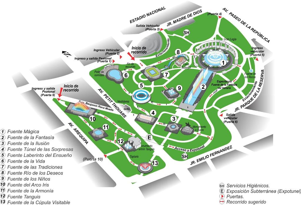 A entradas principais ficam na Av. Petit Thouars e na Av. Arequipa… Pra quem estiver em Miraflores, é muito fácil chegar ao Parque de ônibus, é só pegar qualquer ônibus que vá ao centro pela Av. Arequipa e pedir pra descer no Parque de la Reserva, a passagem é muito barata. O táxi também é bem barato e quem prefere esse meio, deve combinar o preço antes.