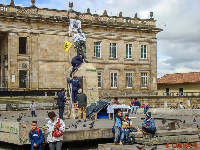 Como cheguei bem cedo, ainda pude ver os funcionários da prefeitura tirando a camisa de protesto contra o governo da Colômbia deixada na estátua de Simom Bolivar.