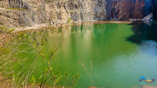 Esta pedreira foi embargada e desativada depois que explosões acabaram atingindo o lençol freático. Com isso, o local foi inundado e assim nasceu a bela lagoa.
