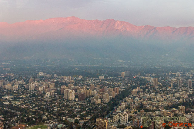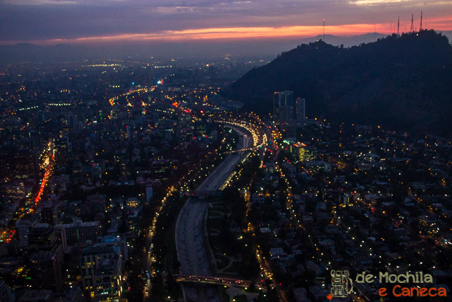 Dali subimos mais um andar por uma escada rolante e logo estávamos diante de um imenso salão coberto por enormes vidraças que permitem a visão em 360º da capital chilena.
