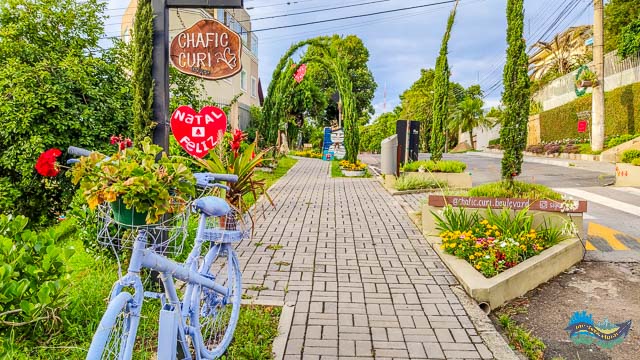 Na rua há bicicletas, balanças, quadros, placas com frases motivacionais, pisca pisca, enfim, muitas e muitas decorações super criativas!