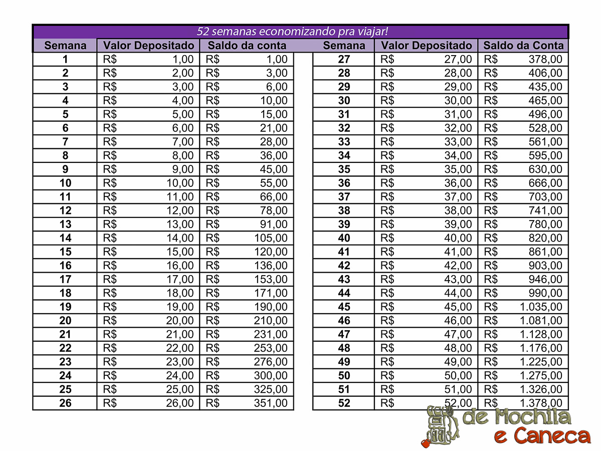 Você deve ir aumentando progressivamente a poupança em um Real, até a 52º semana. Se seguir isso a risca, chegará ao fim do ano com R$ 1.378,00, sem se apertar e praticamente sem sentir no bolso.